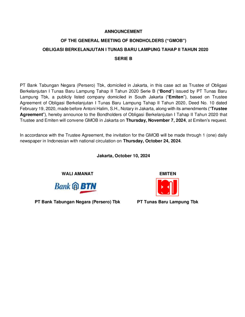 Announcement of The General Meeting of Bondholders (GMOB) Obligasi Berkelanjutan I Tunas Baru Lampung Tahap II Tahun 2020 Serie B