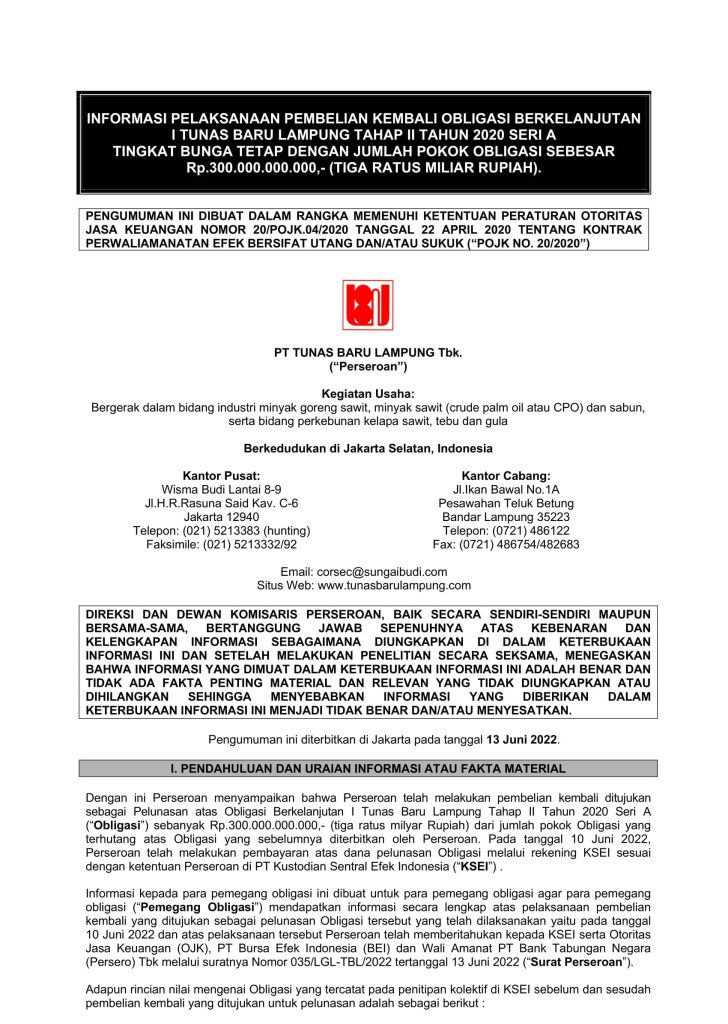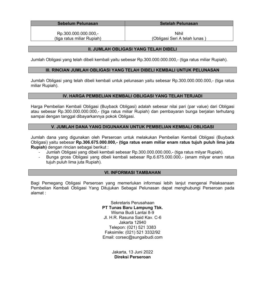 Informasi Pelaksanaan Pembelian Kembali Obligasi Berkelanjutan I Tunas Baru Lampung Tahap II Tahun 2020 Seri A Tingkat Bunga Tetap Dengan Jumlah Pokok Obligasi Sebesar Rp.300.000.000.000,- (Tiga Ratus Miliar Rupiah)